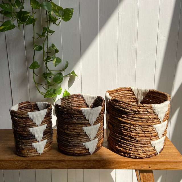 ♦︎店主の「欲しい!!」をカタチにしたBULANオリジナル! インドネシアに自生するアタのつるを使って職人さんにひとつひとつ丁寧に編み込んで仕上げてもらったアタバスケット。写真の通り鉢カバーとしても使用できるようサイズを絶妙に調整しました!こちらは当店オリジナルバスケットになります。 ※Sサイズバスケットには、直径15cmの5号鉢(受皿4号)がシンデレラフィット! 鉢カバーやゴミ箱としてはもちろん、収納ボックスとしても素敵ですね! バリの高級リゾートでも使われているアタ。日常生活にひとつ取り入れると一気に日々の生活を華やかにしてくれます。 新築祝いなどプレゼントとしてもオススメのアイテムです。 《アタ製品について》 雑貨好きな方は一度は目にしたことがあるアタ。インドネシアに自生するシダ科の植物“アタ”が素材の雑貨です。茎の部分を割いて編み込んでいき、約1週間ほど日干しした後にココナッツの実を使って燻します。燻すのは防虫・防カビが目的ですが、燻すことによりアタ製品独特の香りとアメ色に仕上がります。この飴色が和室やナチュラルテイストのお部屋ととってもよく合います。使えば使うほどに味がでてくるアタ。とても丈夫なので何十年とご愛用いただけます。 《アタ製品のお手入れ方法》 普段は乾拭きでOKです。編み目に埃が詰まった場合は市販のブラシや歯ブラシなどで編み目に沿って軽くブラッシングしてください。汚れがひどい場合は水洗いしていただき、天日干しで乾燥させてください。 《アタ製品のクオリティについて》 アタ製品のクオリティは、おもに編目の細かさ、均一さ、丁寧さできまります。BULANでは編み目も細かく一つ一つ丁寧に作られたクオリティの高いものを厳選してご用意しました。 ■サイズ:φ20cm(底14cm)× H19cm ■素材:アタ ■Made in INDONESIA(バリ島・トゥガナン村) ▶︎SIZE XS: https://bulan.base.shop/items/88134272 ▶︎SIZE S: https://bulan.base.shop/items/88134073 ▶︎SIZE M: https://bulan.base.shop/items/69927235 ▶︎SIZE L: https://bulan.base.shop/items/69927427 ▶︎Cylinder: https://bulan.base.shop/items/69926676 =====商品特性・注意点===== ※全て手作業で作られていますので、一つひとつ表情が微妙にことなりサイズの誤差が生じる場合がございます。ハンドメイドならではの魅力であり特性であるとご理解いただければと思います。 ※画像と実物の色味が若干異なる場合がございます。色味等詳しく知りたい方は、お気軽にお問い合わせください。