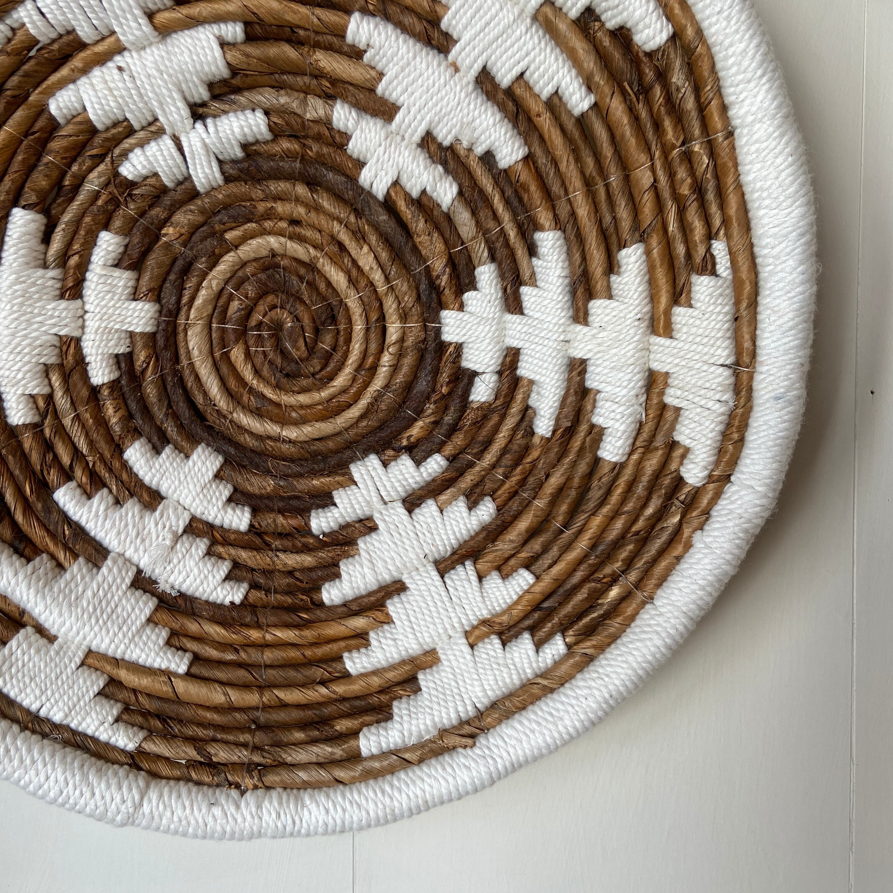 バナナリーフとマクラメコットンを編み込んだボヘミアンでナチュラルなトレイ型壁飾り。