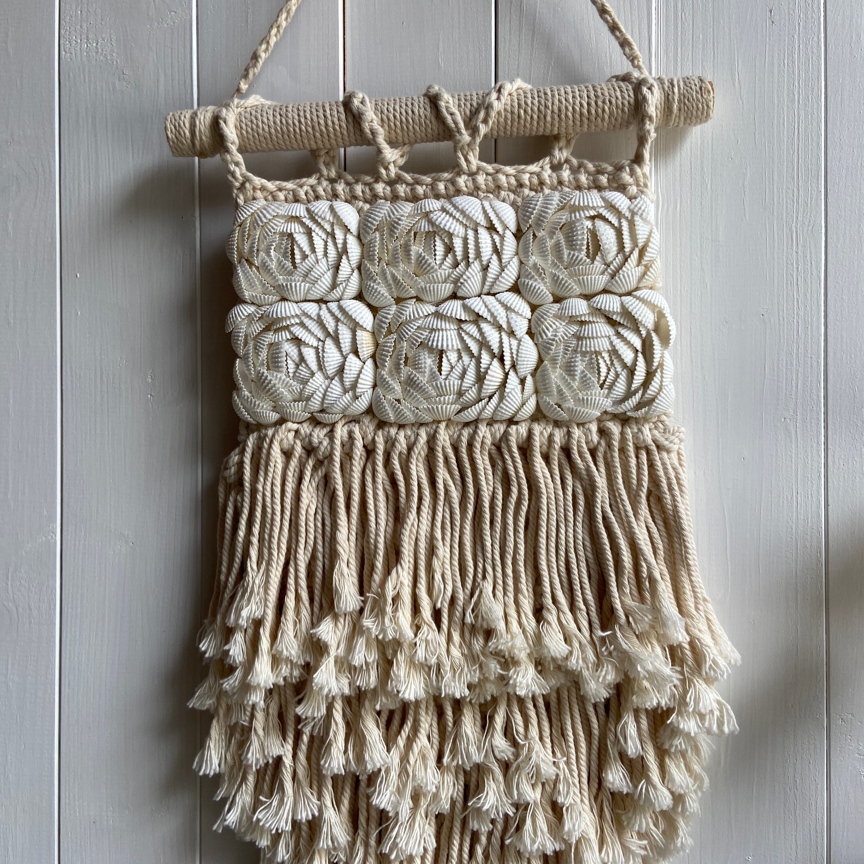 天然シェル(貝殻)で薔薇を装飾したマクラメタペストリー。