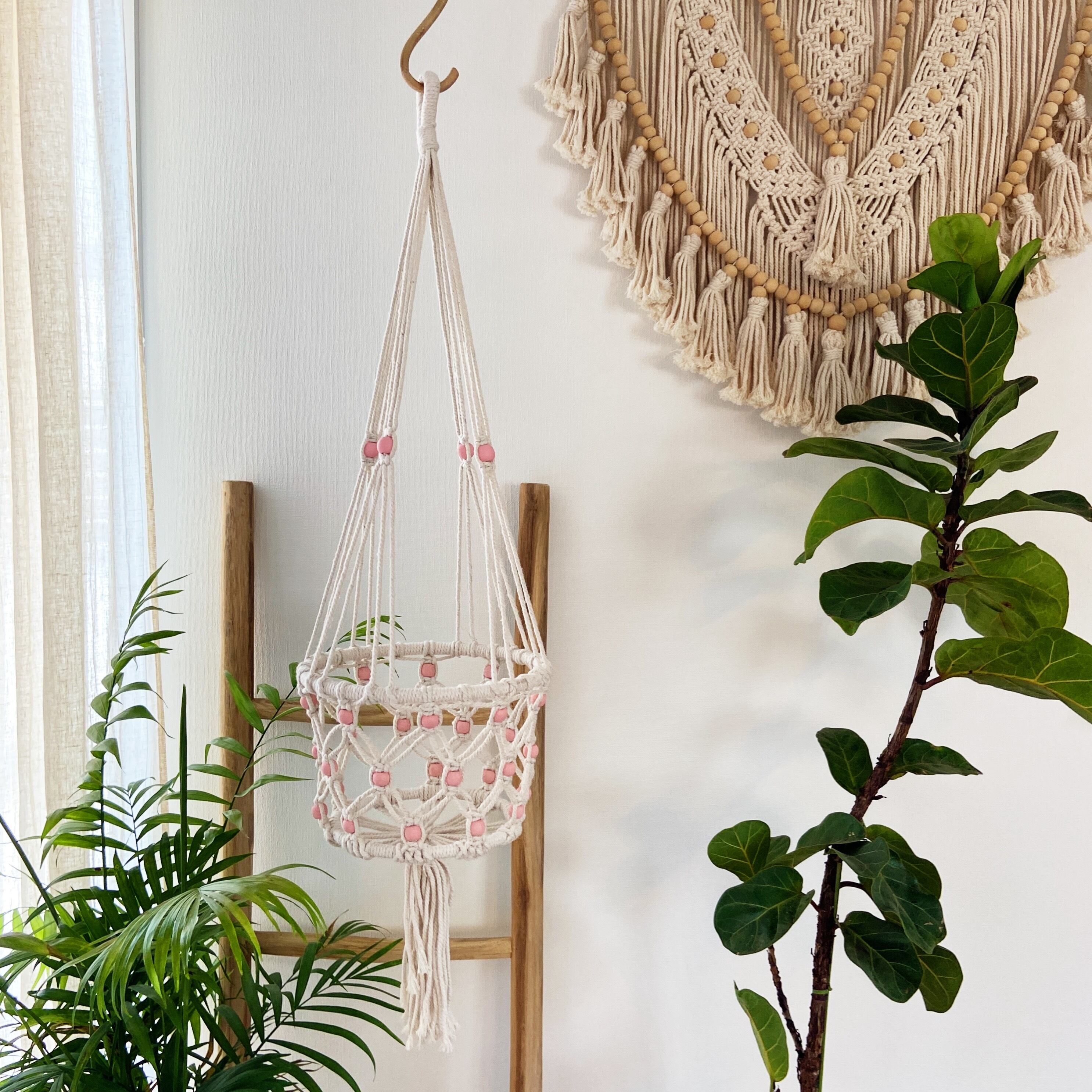 コットンロープで編み上げたマクラメ編みのプラントハンギング。ピンクのウッドビーズ入り。