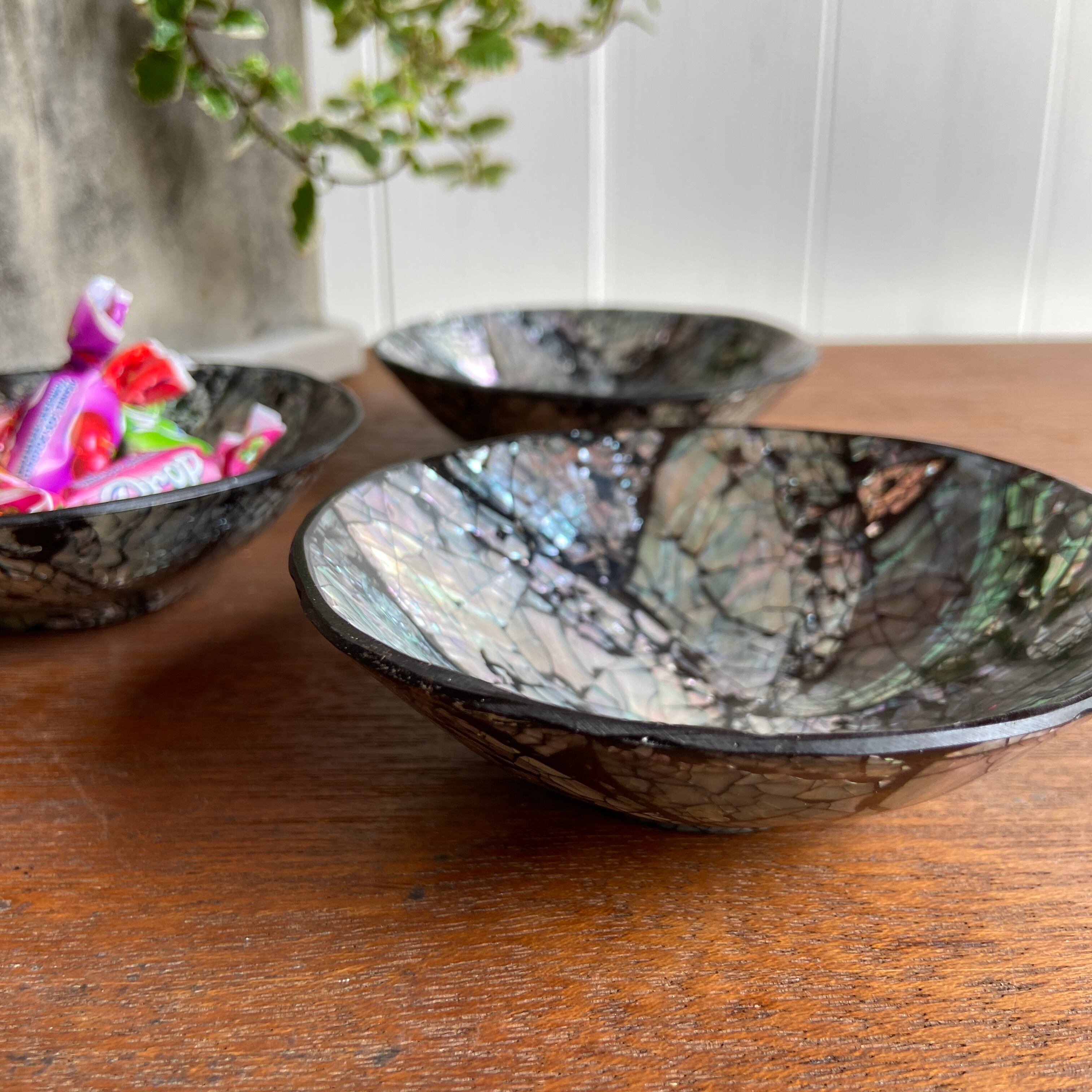 ちょっとしたお菓子やアクセサリーや鍵、小物入れとして♡両面ともにデコレーションされており、表面は樹脂でコーティング。ツヤツヤしています。美しい艶とオーロラのような輝きで置いておくだけでとても華やかな雰囲気になります。