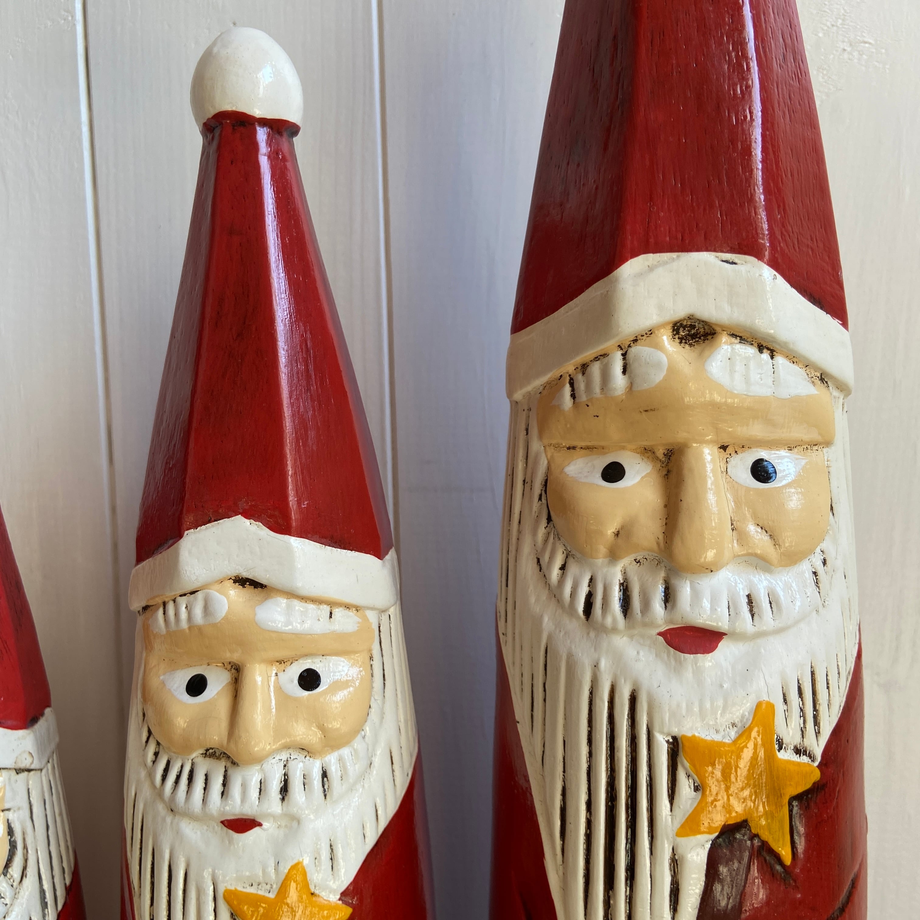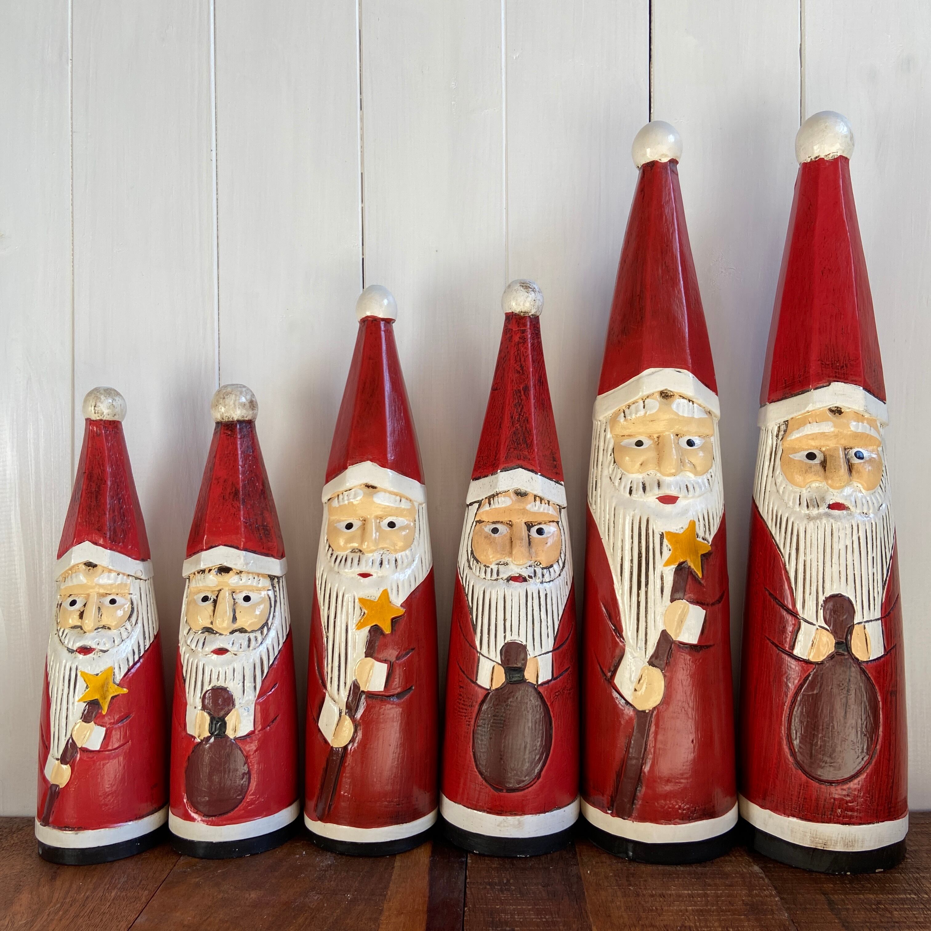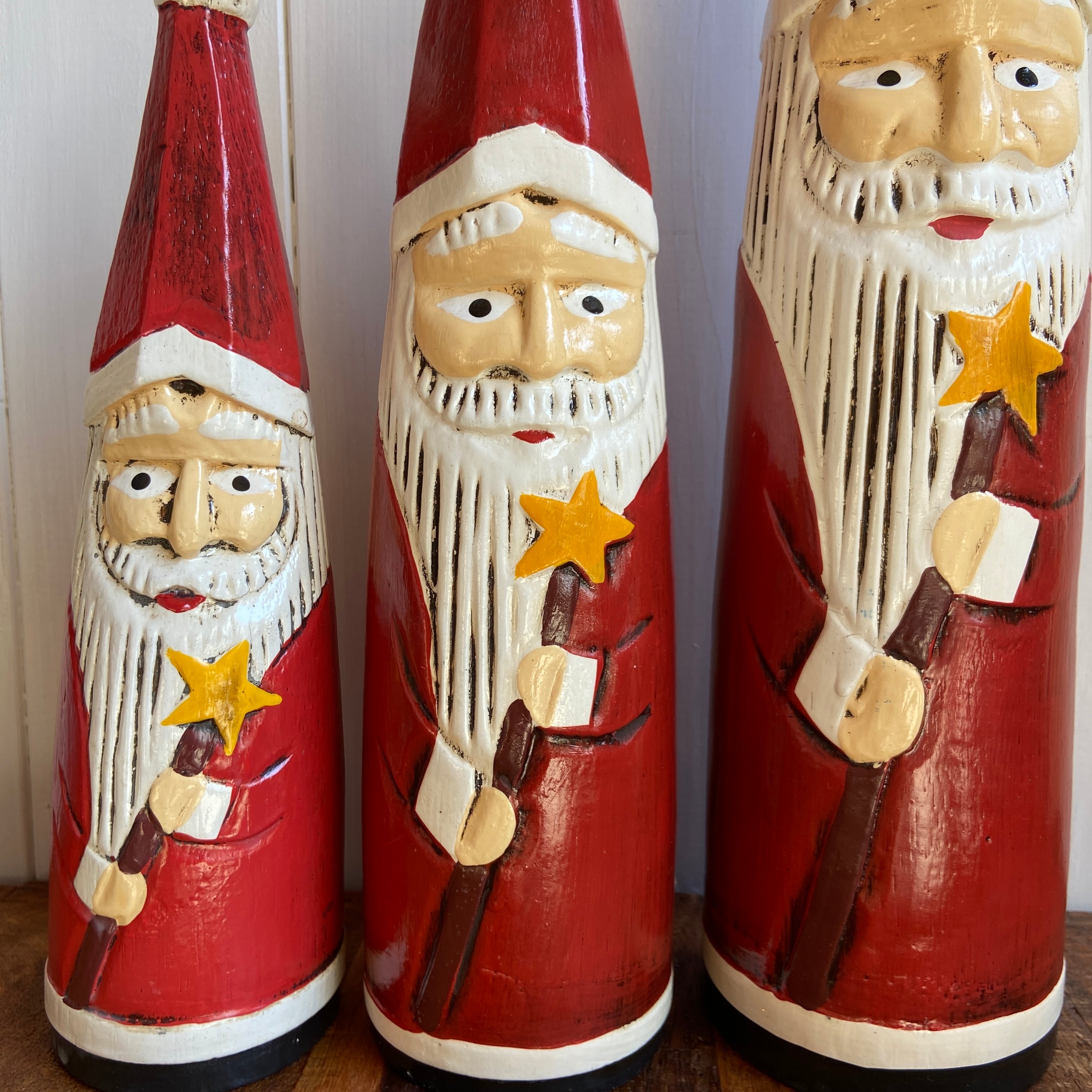 お星様のスティックを持った木彫りのサンタクロースオブジェ。