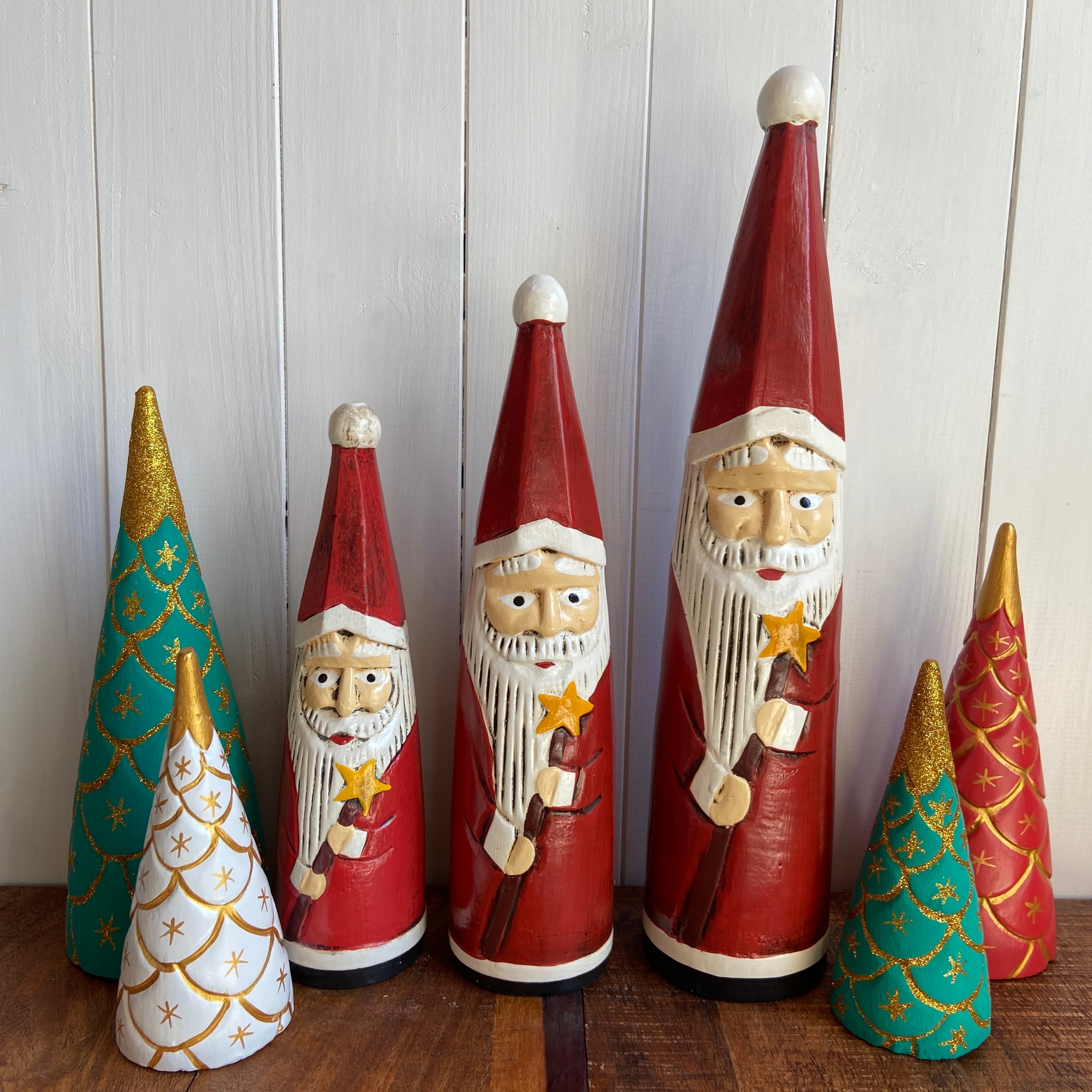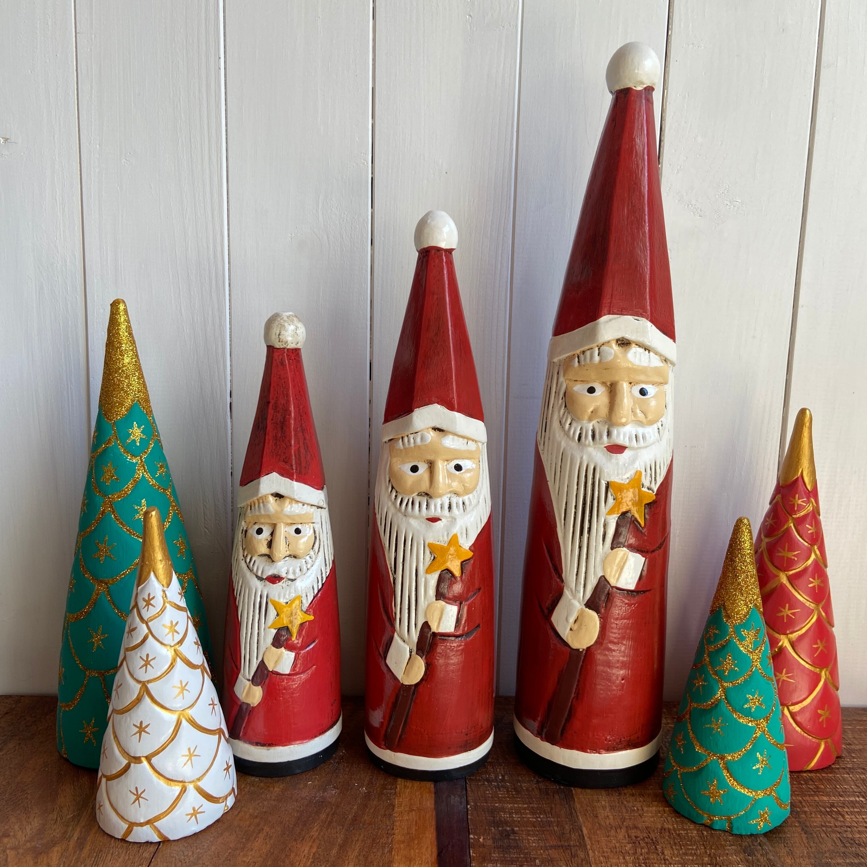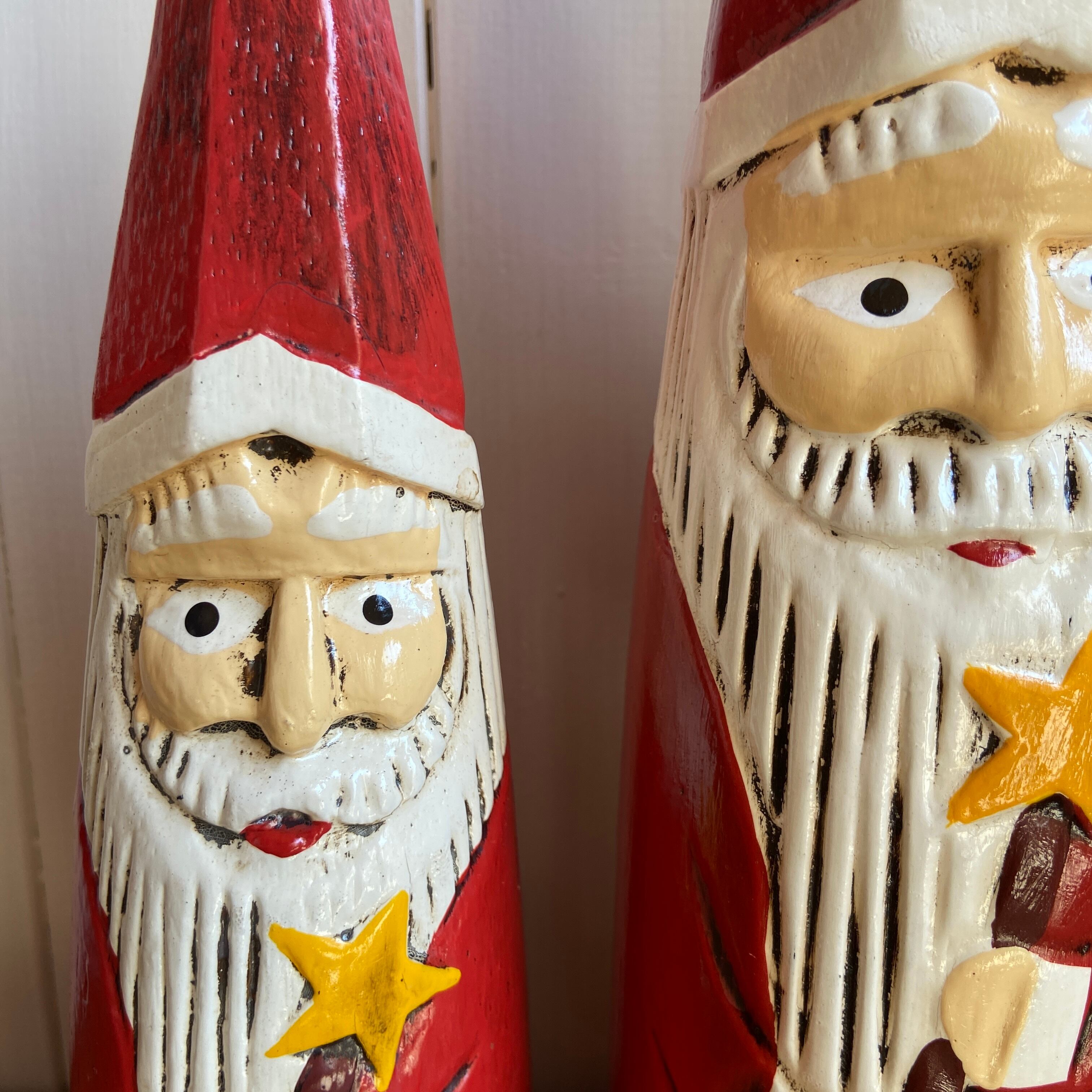 お星様のスティックを持った木彫りのサンタクロースオブジェ。