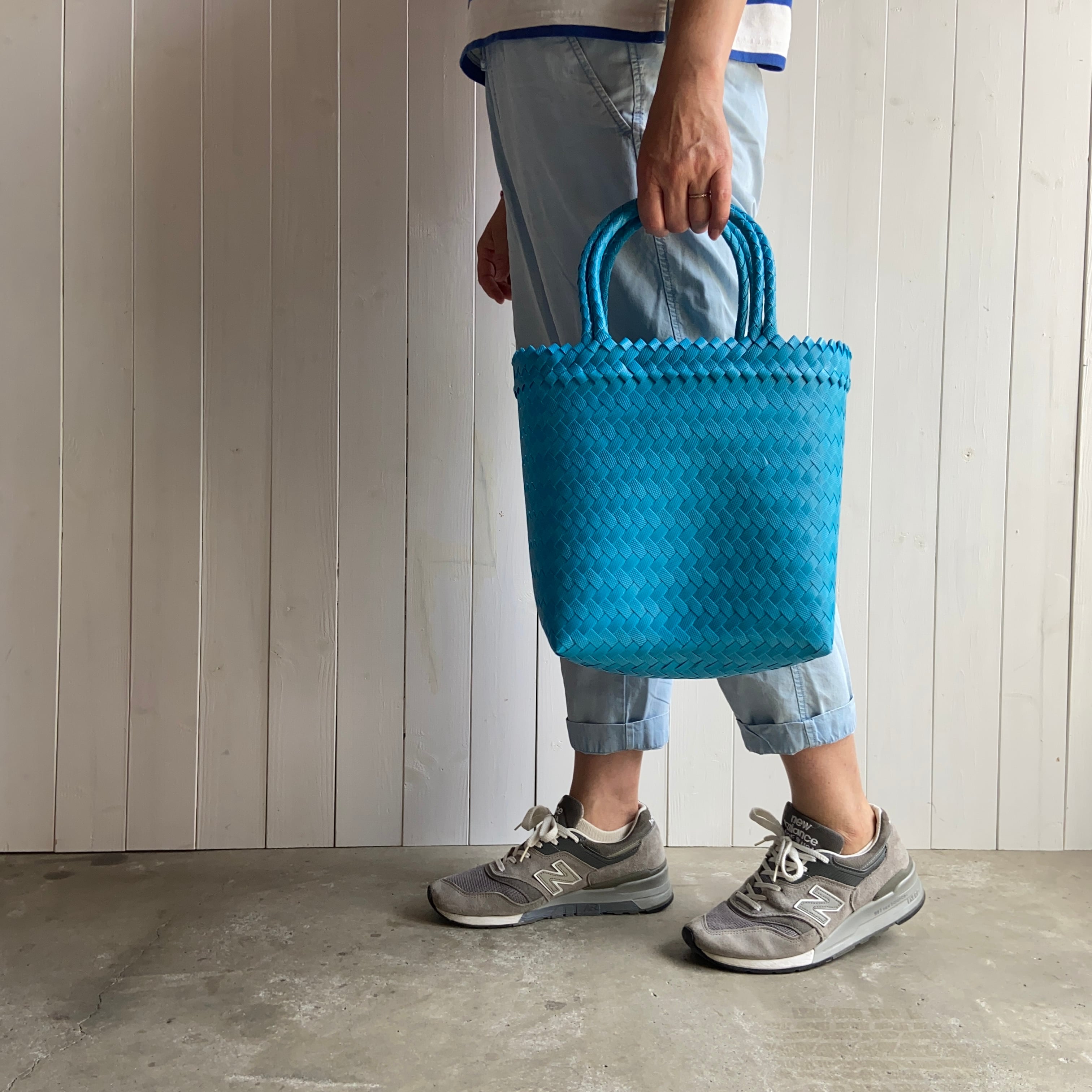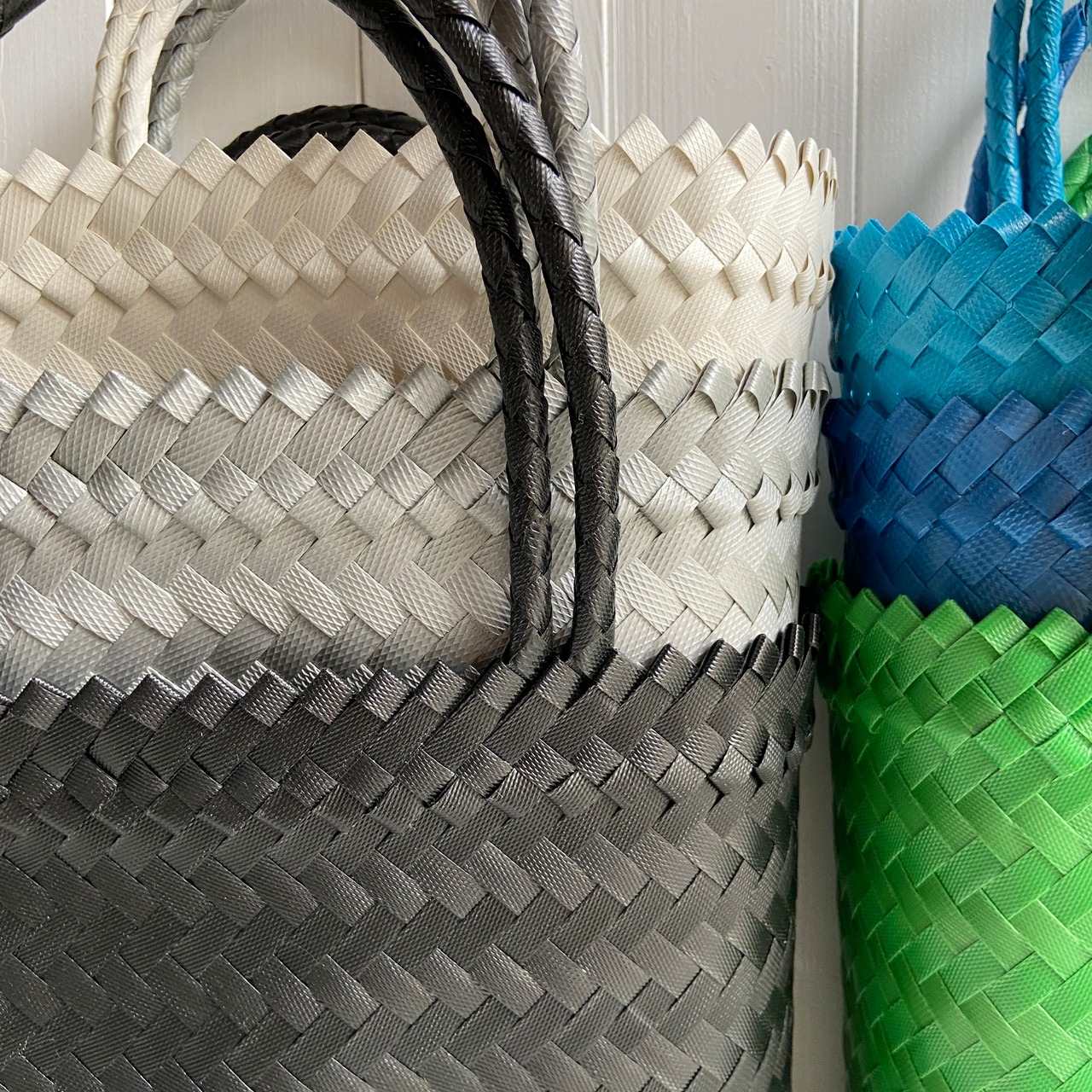 プラスチックテープを一つ一つ手作業で編み込んで作られたとにかく丈夫なエコバッグ。普段のお買い物が楽しくなるようなカラーをご用意しました!